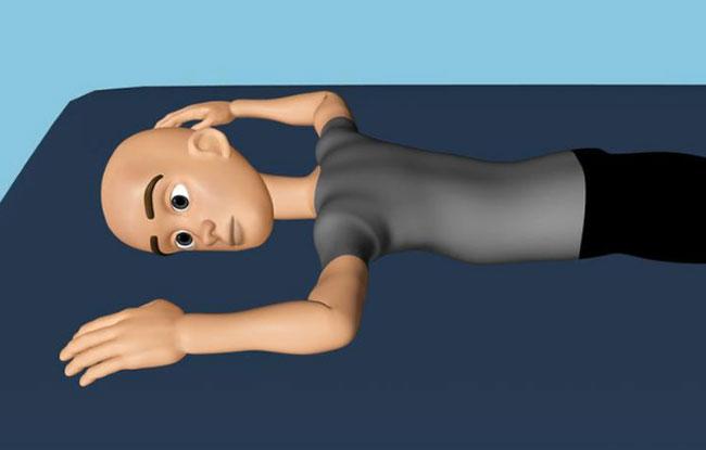 Лягте на твердую поверхность, например пол. Раскиньте руки в стороны, локти согнуты. Голова повернута в сторону.