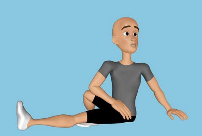 Способ нога-через-ногу с оттяжкой назад. Сядьте на коврик, спина прямая и ноги должны быть вытянуты. Приподнимите аккуратно вашу правую ногу и, держа в согнутом положении, перенесите через левую ногу. Ваша левая нога должна лежать плашмя на полу, а правая касаться пола только лишь ступней возле левого бедра.