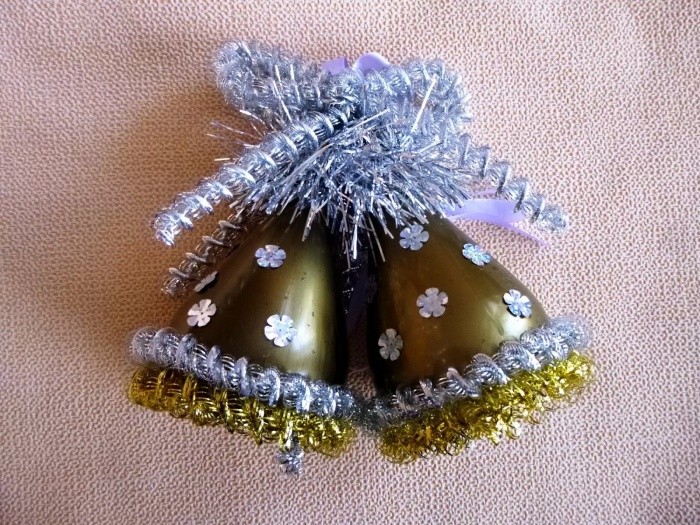 - Соедините два колокольчика, обмотав их под крышками ниткой. Одновременно примотайте кусочки мишуры и отрезок ленты длиной примерно 30 сантиметров (его кончики должны быть равными). Завяжите нитку на узел, оставьте свободный конец и сделайте петлю (это крепление).
