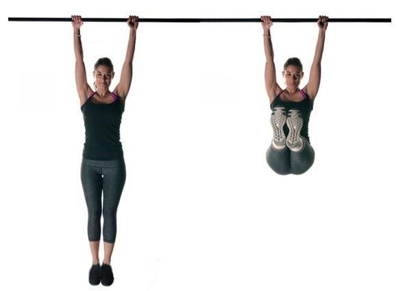 - На турнике. Выполняйте обычный уголок. Возьмитесь руками за перекладину, сделайте вдох и на выдохе поднимите прямые ноги перпендикулярно телу, затем медленно опустите их. Совершайте движение за счет усилия мышц пресса.