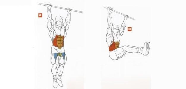 - Подъем ног в висе. Ухватитесь руками за перекладину и старайтесь поднимать ровные ноги до параллели с полом. Новичкам следует поднимать согнутые ноги, стараясь бедрами коснуться поверхности брюшной стенки. Важно не раскачиваться, и работать исключительно брюшными мышцами.
