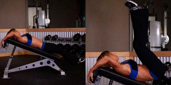 - Подъем ног на спортивной скамье. Выполнять упражнение можно на горизонтальной лавке или скамье под наклоном. Начать следует с горизонтального положения. Нужно лечь на лавку, руки вытянуть вдоль корпуса и ухватиться ладонями за края скамьи. Поднимать ноги надо вверх, слегка согнув их в коленях. В максимальной точке нужно оторвать ягодицы от поверхности лавки.