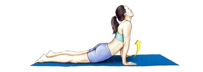 - Плавные прогибы. Ложимся на гимнастический коврик лицом вниз, упираемся в пол ладонями и поднимаем вверх плечевой пояс, одновременно прогибаемся максимально назад, голова движется вместе с туловищем. Медленно возвращаемся в ИП, повторяем в удобном темпе в течение 1 минуты. Движение помогает укрепить длинную, ромбовидные и грудные мышцы спины.