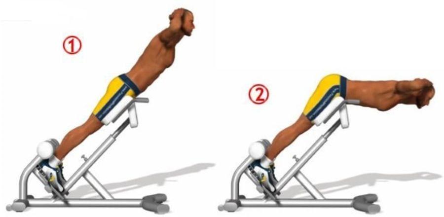 - Гиперэкстензия. Ложимся бедрами на тренажер, опускаемся вниз. В тазобедренном суставе должно быть 90 градусов. Необходимо поднимать корпус так, чтобы тело было вытянуто в сплошную линию. Фиксируем положение на 10-20 секунд, расслабляемся и повторяем 10-15 раз.