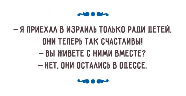 — Конечно, Ефим. Но, с другой стороны, нехорошо, чтобы она осталась в старых девах из-за того, что у нее есть деньги. - Памятка в туалете в одной еврейской семье: «Не сиди просто так, думай что-нибудь».