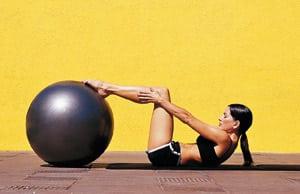 Прижмитесь спиной к полу, ноги согните и упритесь ступнями в мяч. Напрягая пресс оторвите лопатки и голову от пола, дотроньтесь ладонями до верхнего участка голеней. Далее не спеша отведите руки за голову и выпрямляя ноги отдалите мяч от себя. Согните ноги и возвратите мяч в исходное местоположение. Одновременно распрямте руки в стороны и обратно прикоснитесь ими к ногам. Плечи, а также голова должны все время быть на весу.