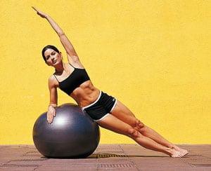 Лягте на мяч правым боком, вытянув ноги, при этом пола касается лишь внешняя сторона правой стопы. Правая рука опирается о мяч, а левая вытянута над головой. Напрягая мышцы пресса и бедер, потянитесь корпусом влево, одновременно поднимая левую ногу вверх. Вернитесь в исходное положение. Выполните все повторы сначала с одной, затем с другой стороны.