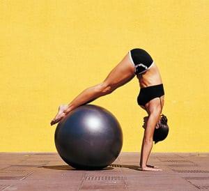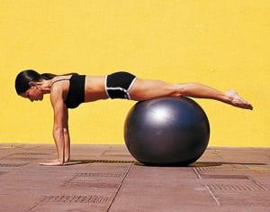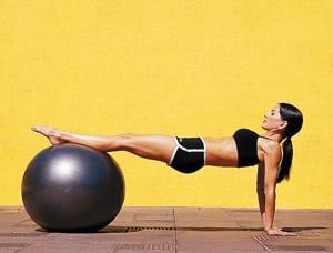 Лягте животом на мяч, поставив ладони на пол на ширину плеч. Переступая руками, перенесите корпус немного вперед так, чтобы мяч оказался под бедрами, а тело образовало прямую линию. Подкатывая мяч ближе к рукам и поднимая таз, сделайте стойку на руках уголком. Вернитесь в исходное положение и повторите.