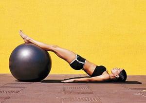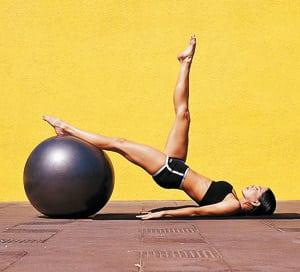 Лягте на пол, выпрямите ноги, положите икры на мяч, втяните живот и приподнимите ягодицы. Ваше тело от пяток до лопаток должно составлять прямую линию. Медленно поднимите левую ногу вверх и опустите. То же самое проделайте с правой ногой. Это составит 1 повтор.