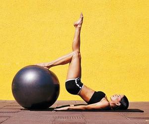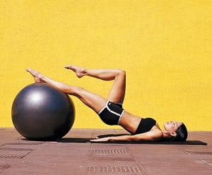 Сядьте на пол, икры — на мяче, руки — в упоре сзади. Напрягая ягодицы, приподнимите таз (ваше тело должно образовать прямую линию от плеч до мысков). Задержитесь на 5 секунд, затем вернитесь в исходное положение и повторите.