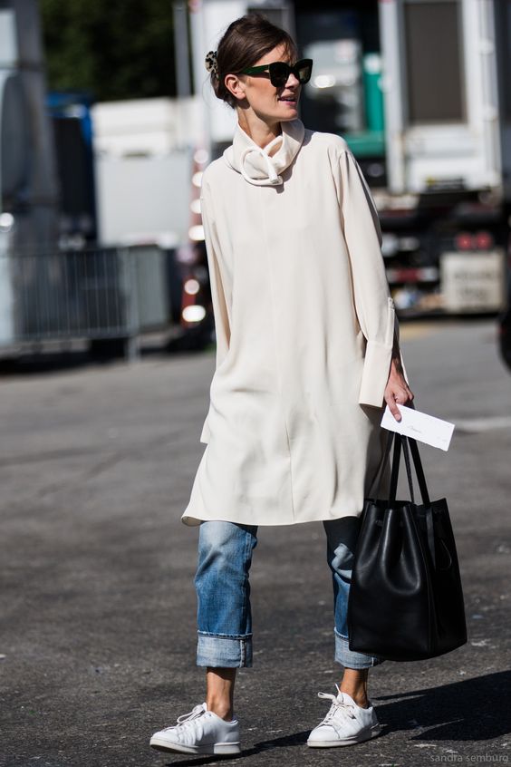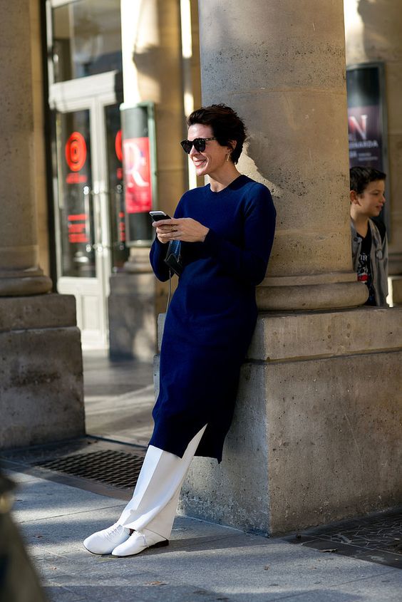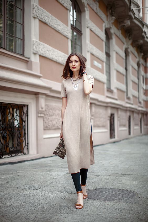 Попробуйте начать с сочетания «платье + леггинсы», ну или возьмите очень узкие брюки из эластичной ткант, которые идут прямо по ноге. Собрать сет с такими брюками не имея опыта проще, чем с джинсами или брюками классического кроя.