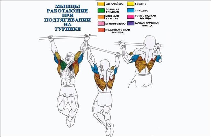 Ассистентами в подтягиваниях на турнике выступают бицепсы, ромбовидные и грудные мышцы.