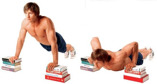 - Отжимания на книгах. Подходит для проработки низа и средней части мышцы. Для тренировки потребуется 8 толстых книг (400-500 страниц). Делим их на две стопки и ставим на расстоянии 60-70 см. Руками делаем упор на книги, тело натянуто в одну линию, носками упираемся в пол. Медленно опускаемся вниз так, чтобы почувствовать растяжение и напряжение в мускулах грудной клетки. Затем выпрямляем руки и поднимаем корпус.