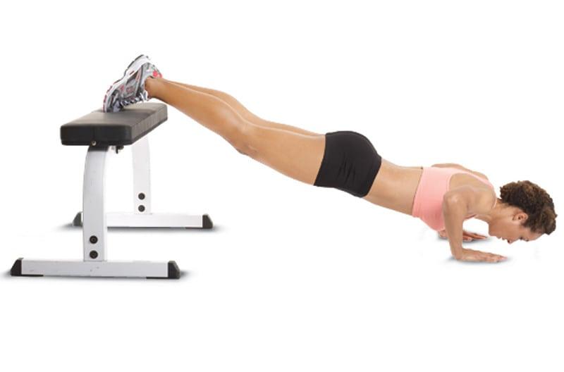 - С наклоном. Этот вид тренинга подходит для верхней части мышц. Выполняются обычные отжимания с единственным отличием – ступни должны быть выше уровня головы. Для выполнения надо носки поставить на скамью, диван или другую возвышенность, а руками упереться в пол.