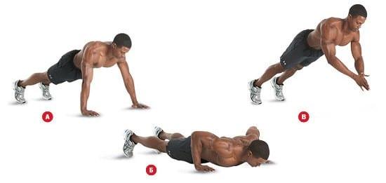 - Взрывная техника. Это упражнение можно выполнять после тщательных тренировок. Делать его лучше в конце программы. Прокачка воздействует на верхние зоны мускулатуры. Оптимально сделайте 2 подхода по максимуму. Алгоритм действий прост – делаем обычное отжимание, но при подъеме корпуса на вытянутые руки, надо оттолкнуться от поверхности и сделать хлопок ладонями. По началу можно просто отрывать руки от пола, и только когда адаптируетесь к движению, можно его усложнить сведением ладоней.