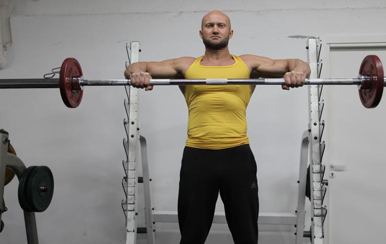 - На выдохе потяните штангу вверх. Локти движутся в стороны. В верхней позиции локти выше плеч, а гриф на уровне ключиц или чуть выше.
