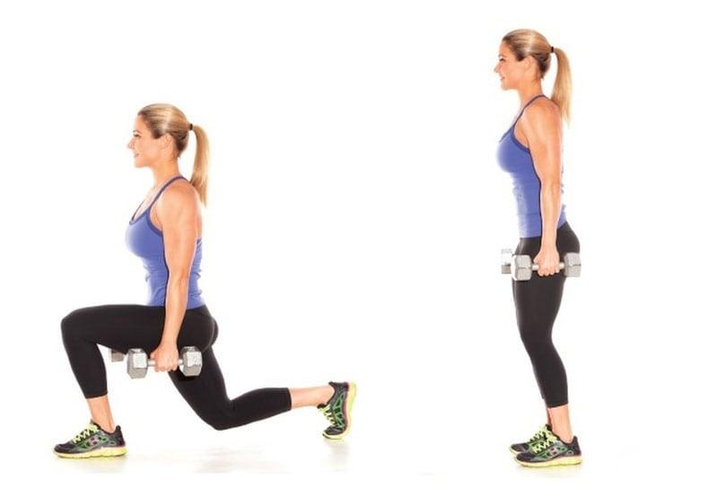 Можно делать выпады вперед и назад, а также диагональные – эти сложнее и заставляют работать внутреннюю и внешнюю часть бедра. А чтобы усилить нагрузку, достаточно заниматься с гантелями или штангой в руках.