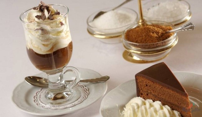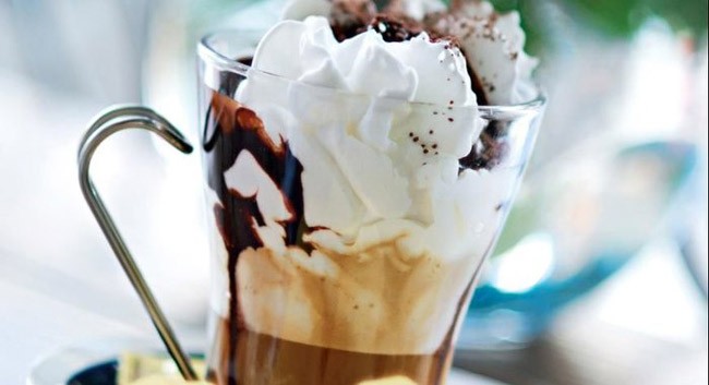 Постарайтесь купить жирные домашние сливки, они лучше всего подходят для этого рецепта. Добавьте в них сахарную пудру и тщательно взбивайте до тех пор, пока не сливки не преобразуются в густую крепкую пену, а потом поставьте емкость с ними в холодильник на время, пока будет вариться кофе. Смешайте свежемолотый кофе с сахаром и заварите в турке. Позвольте готовому кофе немного настояться, процедите его и перелейте в прозрачные бокалы. Наполняйте бокалы кофе до середины, оставляя достаточно места для сливок. Горкой разместив сверху взбитые сливки, полейте их сверху шоколадным сиропом и присыпьте щепоткой какао. Этот напиток следует выпить через соломинку и только потом съесть ложкой густые нежные сливки.