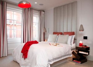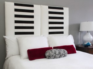 Используйте коллекцию небольших крышек от коробок, или пенопластовых панелей для создания изящной стены для изголовья. Покрасьте их в однотонный цвет, как в спальне, показанной ниже. Вы также можете использовать переработанные картонные коробки, если предварительно растянутые холсты стоят дорого.