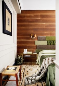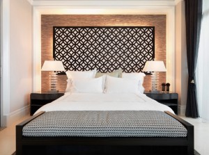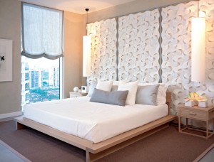 Найдите уникальную стенную панель или деревянные планки и повесьте это как изголовье кровати. Геометрически подобранные планки или разделители, создают самое современное впечатление. Для дополнительной контрастности удалите скучную бумажную подложку экрана и нарисуйте раму экрана в цвете, который вписывается в декор вашей спальни.