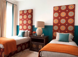 Возьмите картонные коробки и вырежете панели нужных размеров, «оберните их» своими любимыми тканями. Затем повесьте и расставьте с помощью двухстороннего скотча на стены и у кровати. Таким способом можно украсить комнату в любой цвет.