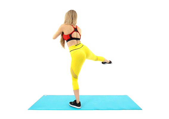 Выполнять упражнение нужно, расставив ноги на ширину плеч. Медленно присядь, держа спину прямо, затем разогни ноги и сделай удар ногой. Повтори упражнение для каждой ноги 25 раз.
