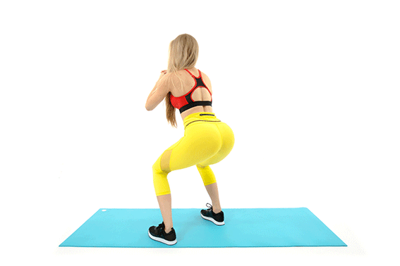 Начинай выполнять упражнение, расставив ноги на ширину плеч. Медленно присядь, следи чтобы колени были на одном уровне с носочками, а спина прямая. Поднимаясь в исходное положение, не разгибай до конца колени, помни, что это неполное приседание. Повтори упражнение 25 раз.