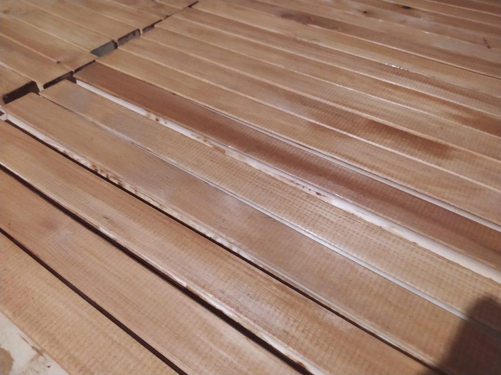 Бруски распиливаются под нужный размер, каждая часть дерева с двух сторон покрывается влагозащитным лаком-пропиткой, затем фасадная часть дерева дважды покрывается яхтным лаком.