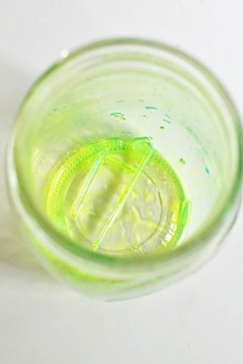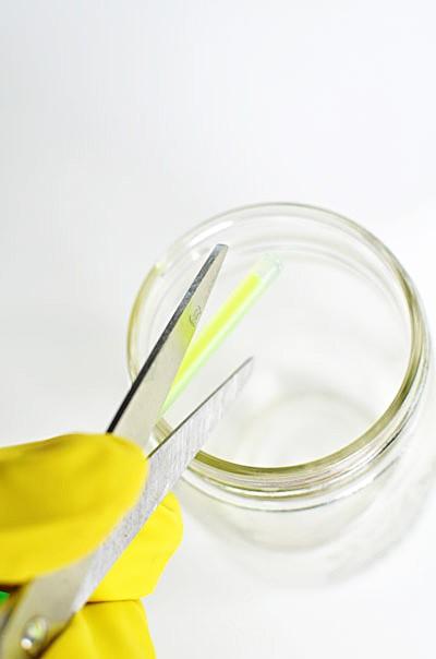 Обязательно одеваем резиновые перчатки, берем две светящиеся палочки, подносим к банке и обрезаем кончики. Все содержимое выливаем в банку. Можно использовать несколько цветов, после смешивания которых получится оригинальный эффект.