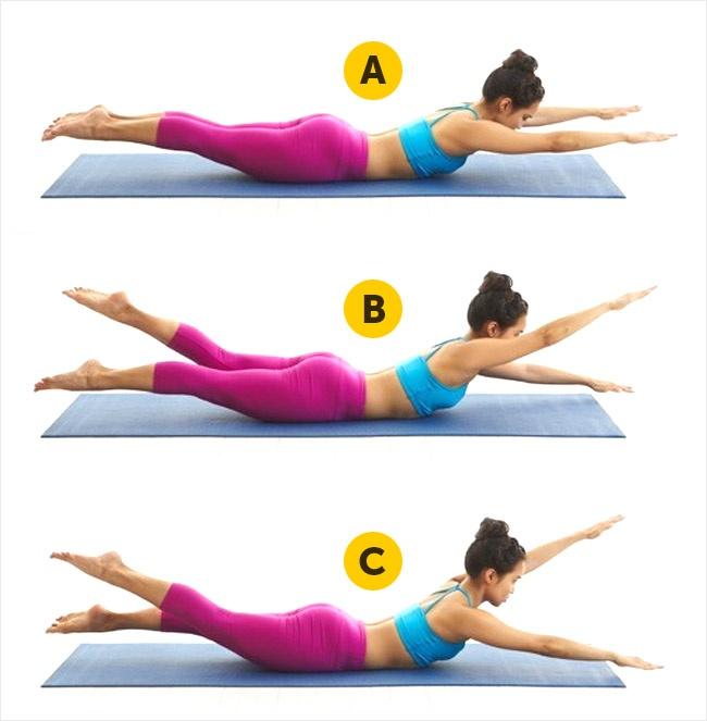 - Лягте на коврик животом вниз. Поднимите руки, ноги, голову таким образом, что вы будете опираться только на живот.