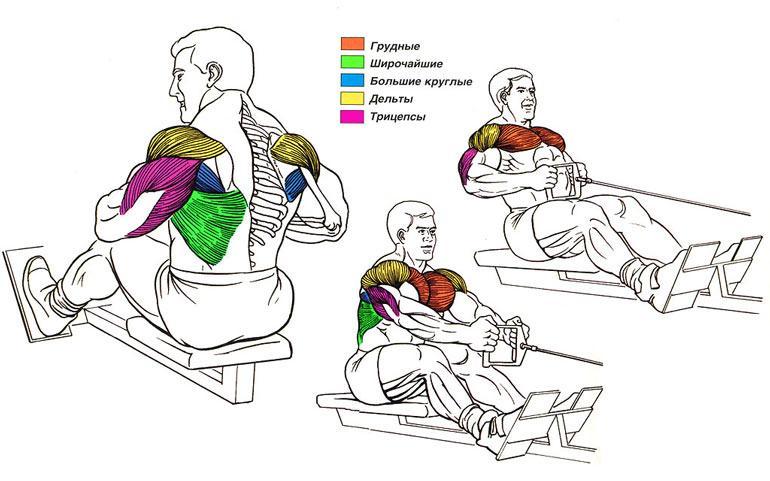 Дополнительная нагрузка идет на трицепс, бицепс, задние дельты и грудь. С соблюдением правильной техники основная нагрузка будет идти на широчайшие мышцы, остальные группы работают в пассивном режиме. Когда я вижу посетителей спортзала, которые изо всех сил рвут рукоять к поясу за счет рук, дополнительно помогая себе ногами, я понимаю, что без теории практика почти бесполезна. Помните, рукоять тянется не за счет бицепса, а с помощью широчайших. Фокусируйтесь на мышце, прочувствуйте, как она работает, и тогда тяга будет эффективной.