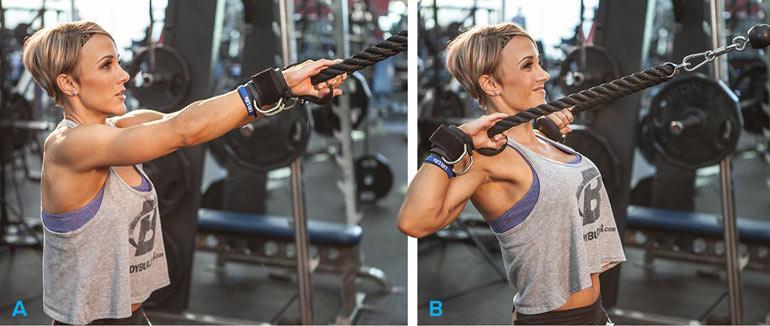 Приведение рукояти к лицу больше относят к категории движений на плечи, потому что основная нагрузка существенно смещается на эту мышечную группу. Тем не менее, такая тяга хорошо прорабатывает верх широчайших и задние дельты. Я рекомендую делать такой вариант тем, у кого отмечаются проблемы с осанкой. В таком случае идеальной будет схема чередования классической тяги в положении сидя и подведению рукояти к лицу (к подбородку, если точнее).