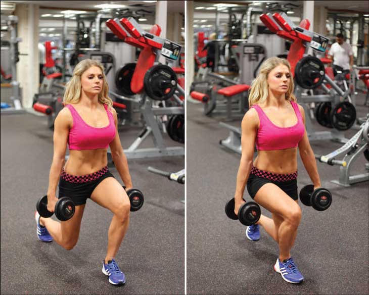 Сделай шаг вперёд с правой ноги и опусти корпус вниз до образования прямого угла переднего бедра и голени. Не заводи носок за пределы стопы и сделай упор на пятку. Задержись на 1-2 секунды, поднимись наверх и поменяй ноги – теперь шагни с левой ноги.