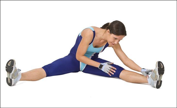 - Разведи прямые ноги максимально в стороны и вытяни руки вперёд. Сделай 10 наклонов вперед и задержись на 10 счетов в положении, чувствуй натяжение мышц между ног
