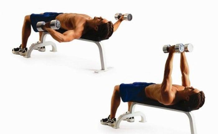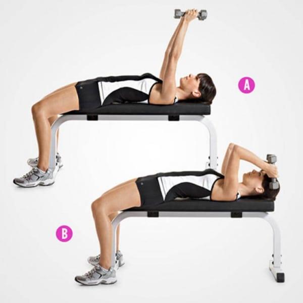- Французский жим из-за головы. Лягте на спину, в руки возьмите гантель, поднимите их над собой и наклоните в сторону головы на 15-20 градусов, локти удерживаем ровно. Нужно сгибать руки, чтобы коснуться инвентарем поверхности пола.