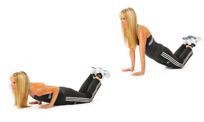 Завершить работу на трицепс можно упражнением без гантелей, например, отжиманиями узким хватом. Для этого примите положение упор лежа, став на колени и ладони. Амплитуда движения свободная, главное – отводить локти назад.