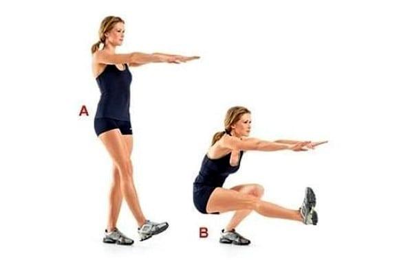 - Приседания. Можно использовать классическую технику – ноги на ширине плеч, руки вытянуты вперед. Приседаем, слегка отводя попу назад, спина прямая.