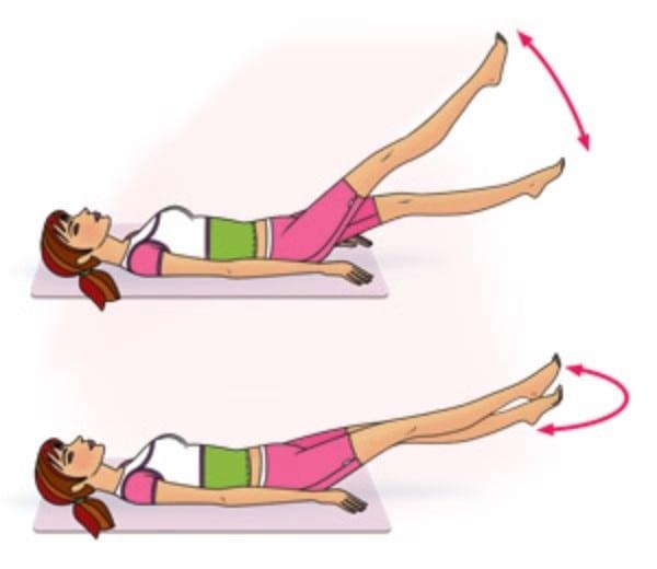 - Подъем ног под углом в 45 градусов. Лягте не спину, руки вытяните вдоль корпуса тела, ноги вместе. Делаете вдох и медленно поднимаете ноги до уровня в 45 градусов. Фиксируем положение на несколько секунд и опускаем ноги.