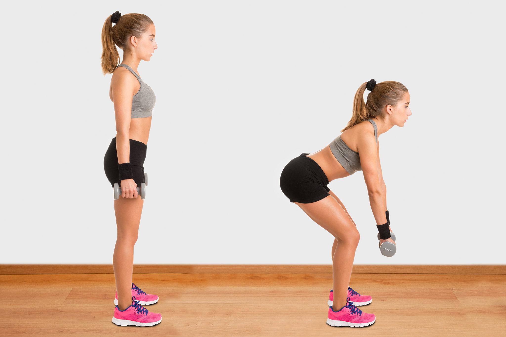 - Становая тяга. Выполняется с гантелями. Ноги на уровне плеч, слегка согнуты, в руках гантели. Сохраняя спину ровной, начинайте наклоняться вперед. Угол в коленях на протяжении всего комплекса изменять нельзя. На выдохе поднимаемся в исходную позицию, задействовав ягодичные мышцы.
