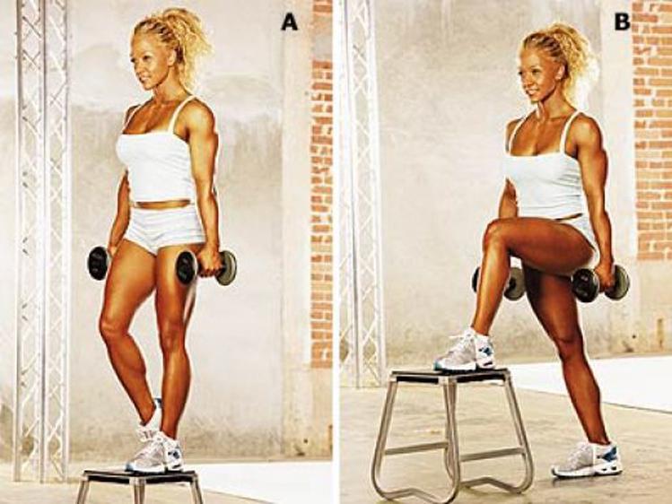 - Шаг на ящик. Для этого занятия потребуются гантели и деревянный ящик (возможно, другая возвышенность). Взяв гантели в руки, делаем шаг на ящик, приподнимаем все тело вверх. Чередуем левую и правую ноги.