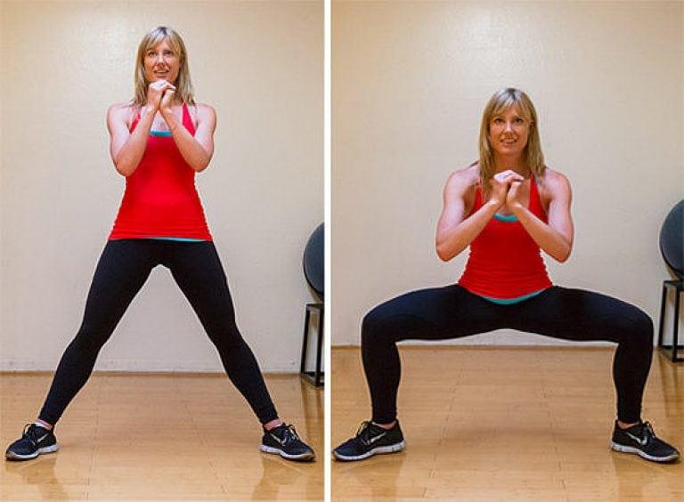 Встаньте прямо, ноги – шире плеч, примерно на метр друг от друга. Носки разворачиваем по диагонали в стороны. Медленно приседаем, пока бедра не будут параллельны полу, затем медленно встаем. Повторить 10-15 раз.