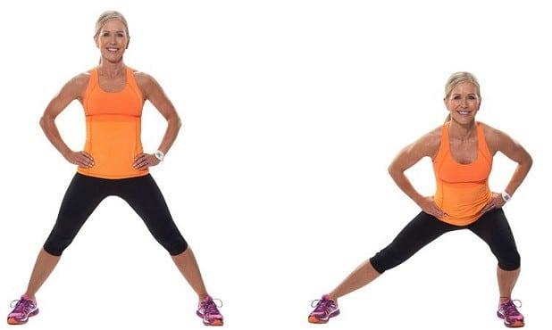 Ставим ноги шире плеч, спина прямая, руки можно вытянуть вперед или поставить на талию. На вдохе выполняем присед вправо, сгибая ногу в коленной чашечке на 90 градусов. Выдыхая, возвращаемся в положение ровно, и делаем выпад влево. По 12-15 раз в каждую сторону достаточно для начала.