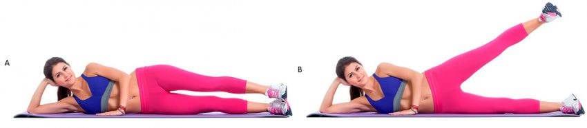 Они полезны и для внутренней, и для внешней поверхности бедра, а также задействуют нижнюю часть брюшного пресса. Есть целых три способа исполнения, все делаются лежа на полу с упором на локоть. По 15 раз на каждую сторону.