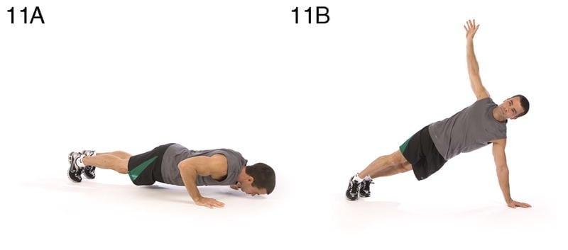 Лежа лицом вниз, упритесь ладонями в пол на уровне груди. Опираясь на носки, выпрямите руки и отожмитесь от пола, удерживая прямой корпус. Перенеся вес тела на левую руку, развернитесь вправо и поднимите правую руку вверх. Задержитесь в такой позе на 5-10 дыханий. Если сразу тяжело, можно опереться на колено левой ноги. Повторите то же с другой рукой.