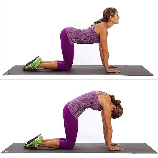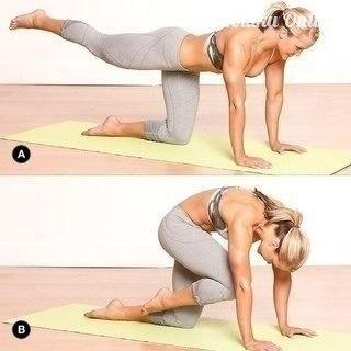 Стоя на коленях, прямыми руками упритесь в пол. На вдохе поднимите голову вверх, максимально прогните спину и задержите дыхание. На выдохе опустите голову, упершись подбородком в грудь, выгните спину вверх и задержитесь в такой позе на 5-10 дыханий.