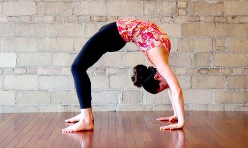 Лежа на спине, согните ноги в коленях, а руки вытяните вдоль тела. Упираясь пятками в пол, поднимите таз максимально вверх, а вес тела удерживайте руками. Задержитесь в таком положении на 5-10 дыханий.