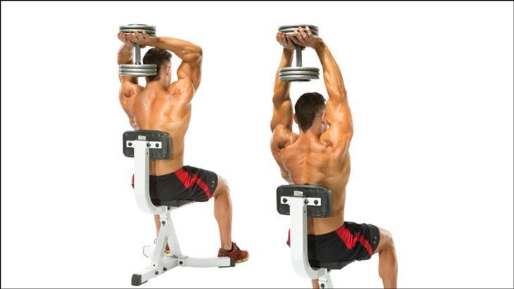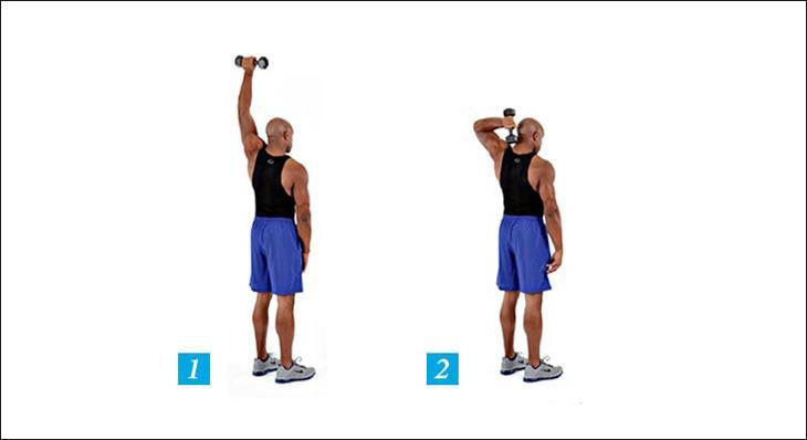- Разгибание гантели из-за головы стоя – 8-12 повторений по 3-4 сета или разгибания рук с гантелью сидя – 8-12 повторений по 3-4 сета