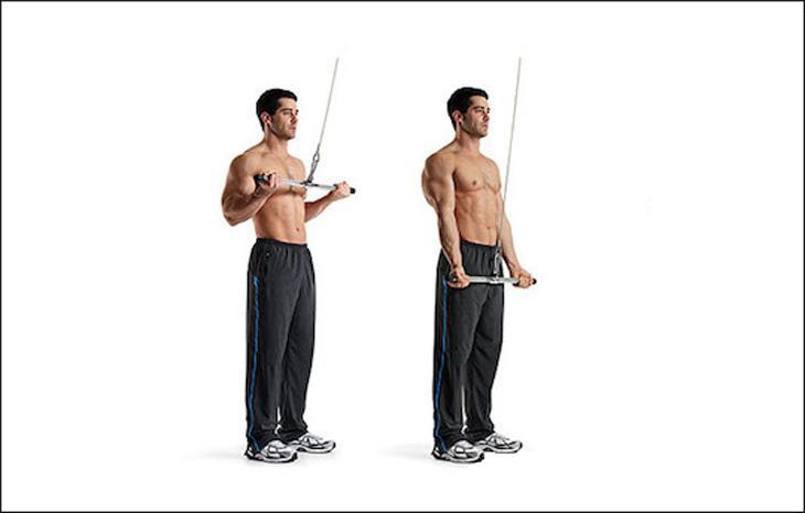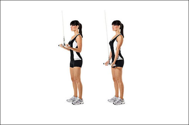 - Разгибания рук на вертикальном блоке – 10-15 повторений по 2-3 сета