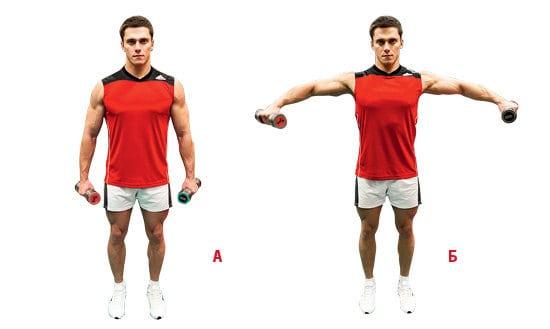 - Разведение рук в стороны. Выполнять упражнение надо с гантелями. Оно отлично прорабатывает мышцы рук, плеч и косвенно груди. Стоим прямо, ноги врозь на расстоянии 40-50 см. Делаем вдох, и разводим руки в стороны так, чтобы они стали параллельны полу. Выполняем 12-15 повторений. Для прокачки рук также отлично подойдут отжимания и подтягивания.