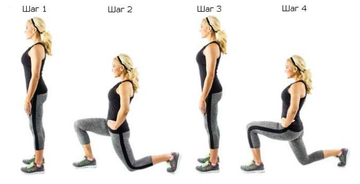 - Выпады. Станьте прямо, в руки возьмите гантели. Сделайте шаг вперед и присядьте так, чтобы бедро оказалось параллельно поверхности. Вернитесь в ИП, повторите 10 раз для каждой ноги.